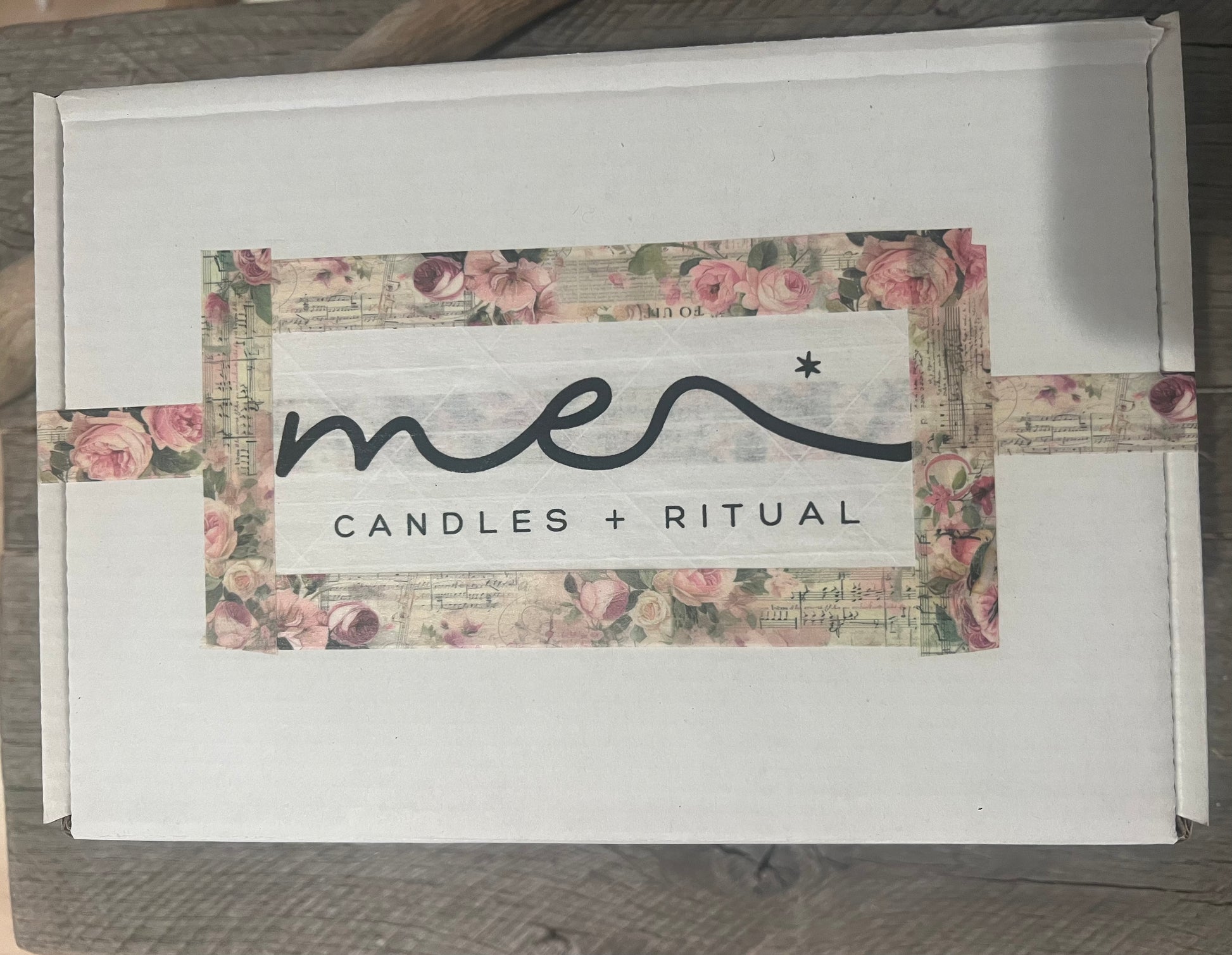 ME x Bridger Botanics Valentine’s box includes a rose soy candle, lavender bath ritual, open-heart tea, matches + ritual card.